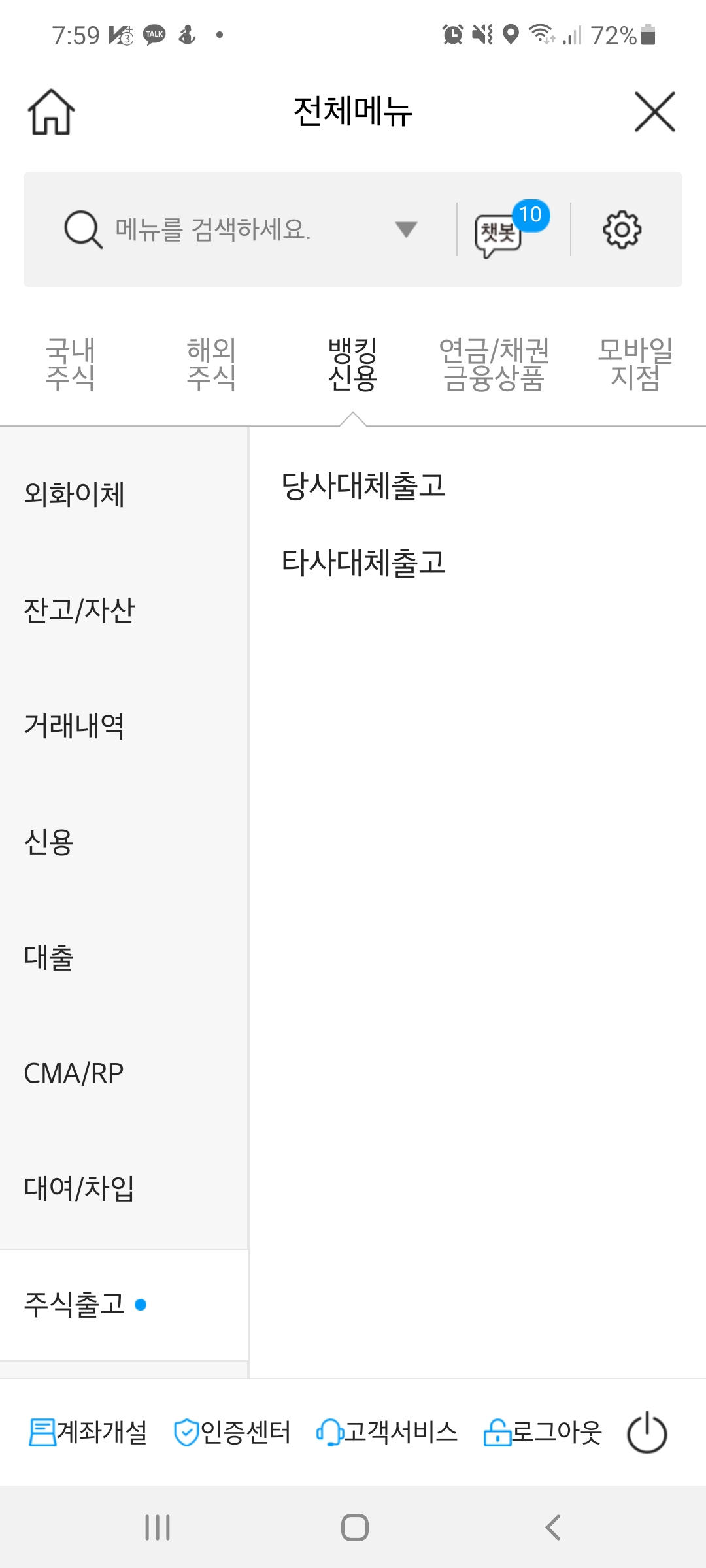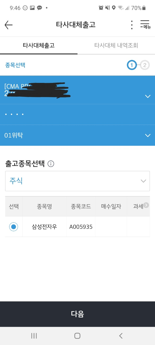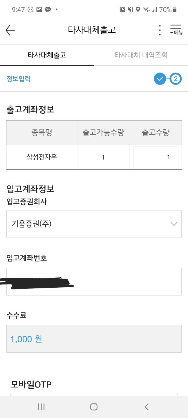 어플에서 뱅킹신용-주식출고-타사대체출고로 들어가주세요