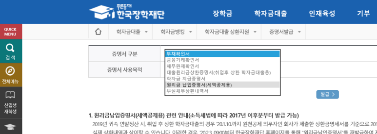"학자금 대출"탭에 맨 오른쪽에 있는 "증명서발급" 클릭하시면 됩니다.