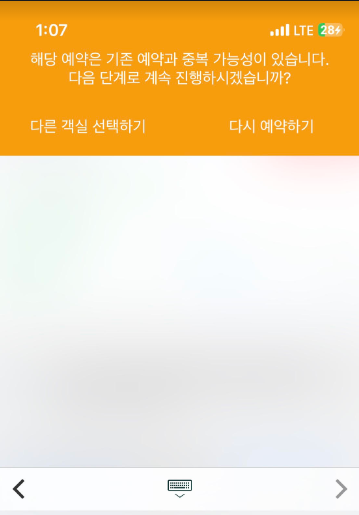"해당 예약은 기존 예약과 중복 가능성이 있습니다. 다음 단계로 계속 진행하시겠습니까?" 라는