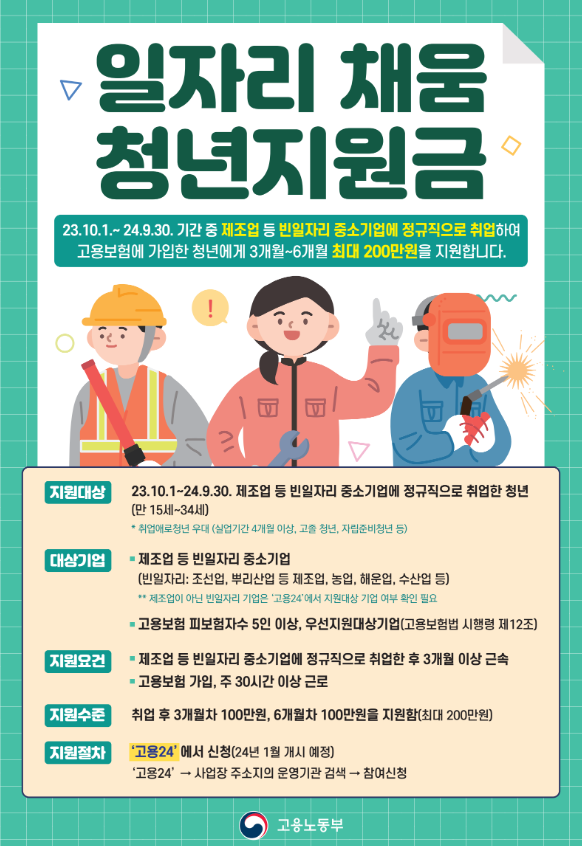 23.10.1.~'24.9.30. 기간에 제조업 중소기업에 정규직으로 취업하여 고용보험에 가입한 청년