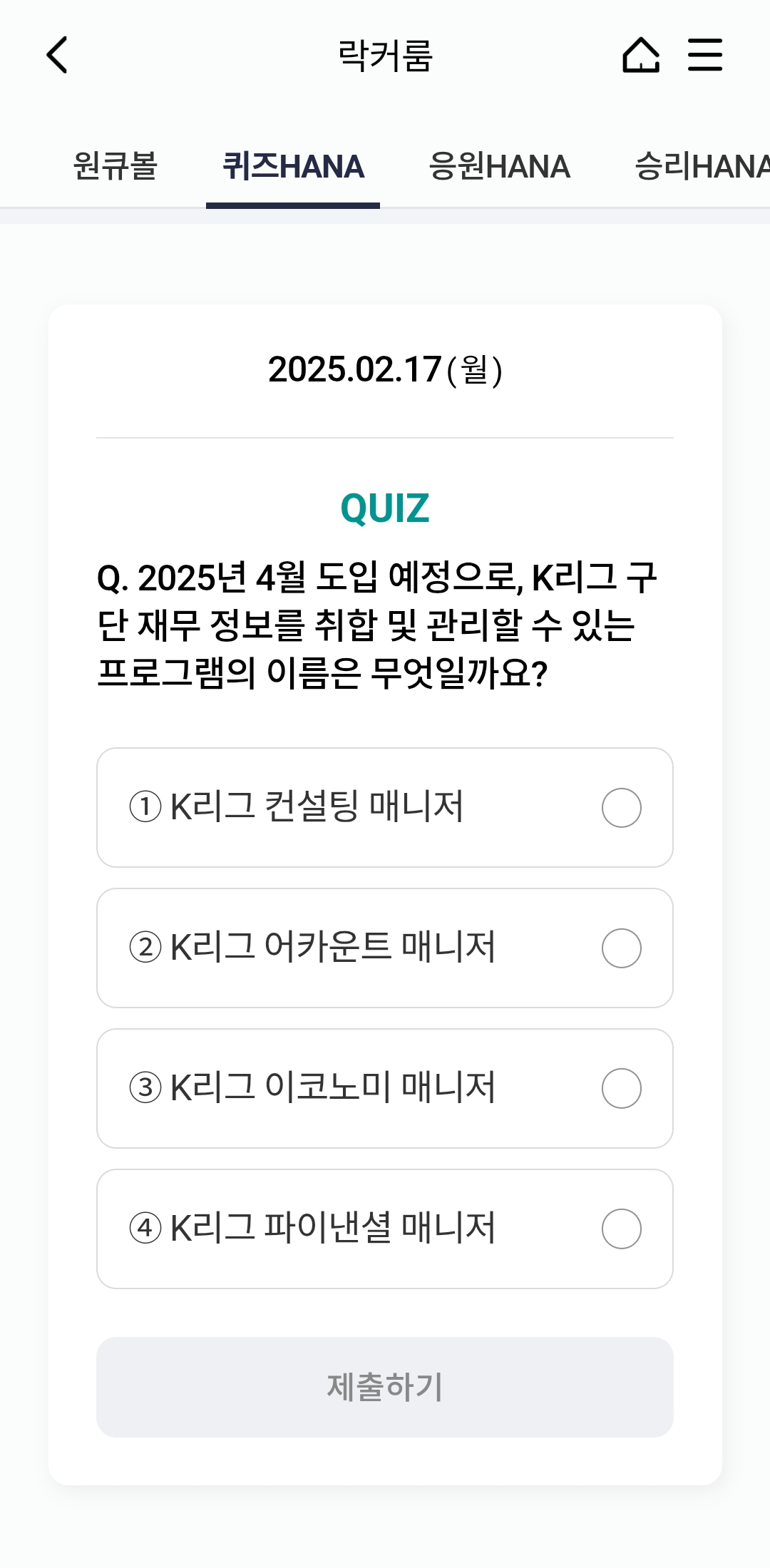 하나은행 원큐볼 퀴즈 정답 2월17일 Q. 2025년 4월 도입 예정으로, K리그 구단 재무 정보를 취합 및 관리할 수 있는 프로그램의 이름은
