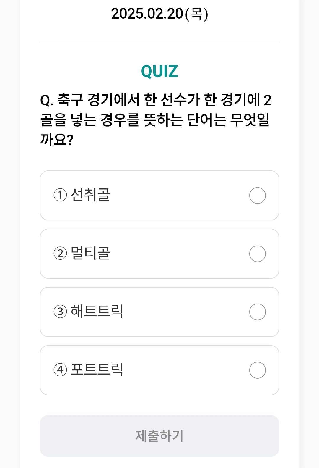 Q. 축구 경기에서 한 선수가 한 경기에 2골을 넣는 경우를 뜻하는 단어는 무엇일까요?