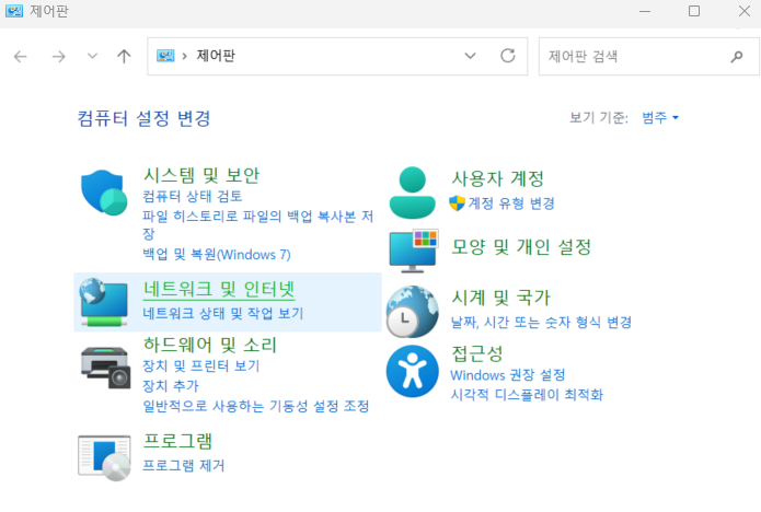 2. 네트워크 및 인터넷에 "네트워크 상태 및 작업 보기"를 눌러줍니다.