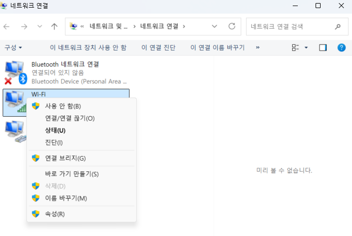 4. 설정하고싶은 와이파이아이콘 위에 우클릭 후 속성을 눌러줍니다.